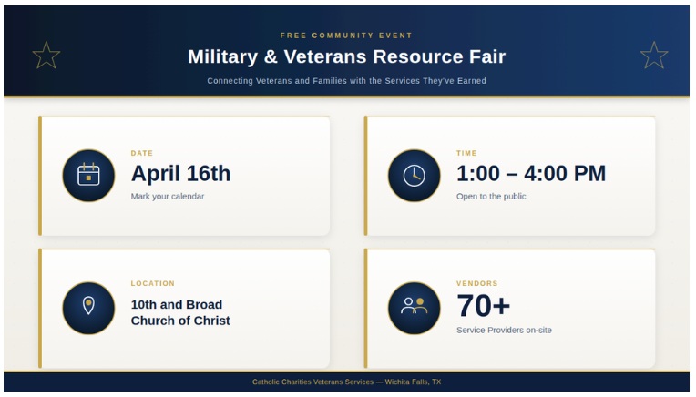 Veterans can contact Catholic Charities directly by calling 940-716-9669 or visiting their office at 907 Holiday Street. A great first step is also attending the Military & Veterans Resource Fair on April 16th to connect with dozens of service providers in one place. For a deeper dive into the local support system, you can also listen to the full conversation on The Falls Home Front podcast.